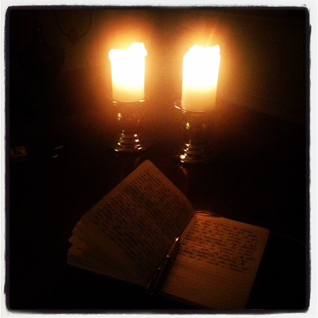I går aftes skrev jeg aftensider. En pludselig længsel efter at mærke mig selv gennem ordene gjorde, at jeg fandt en notesbog og min pen frem. Jeg tændte stearinlysene på spisebordet. Udenfor var der mørkt og det eneste jeg kunne se i vinduerne var mit eget spejlbillede. En kvinde ved et bord. En bog, en pen og to stearinlys.