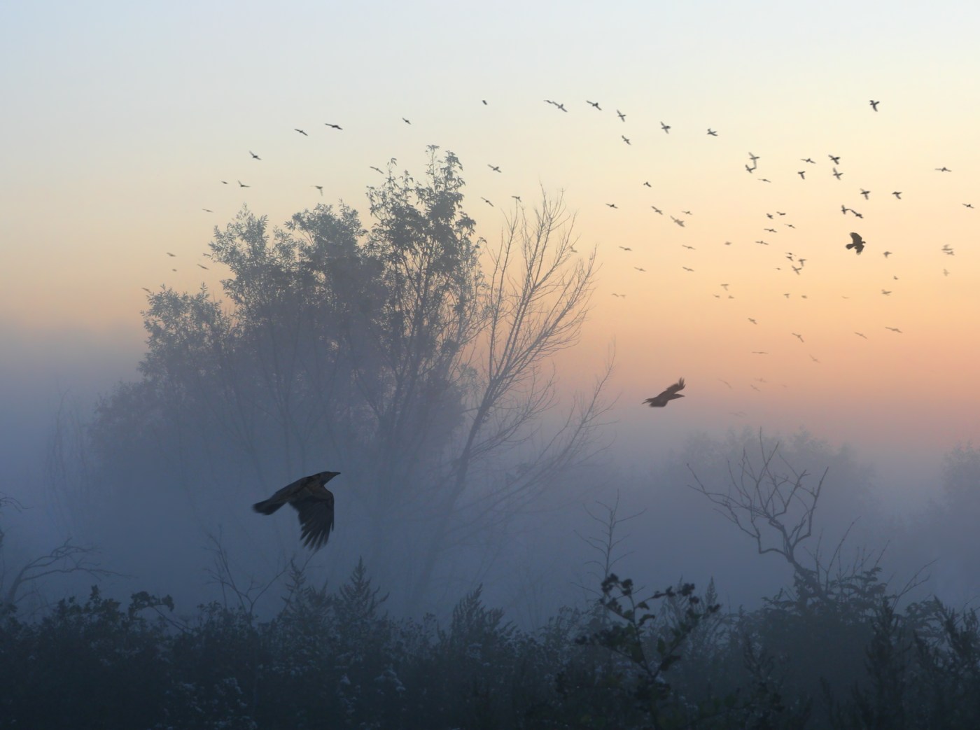 Jeg skrev min bog færdig (sporlægningsfasen) og drak af kaffen, jeg så stearinlyset blafre og et par fugle flyve forbi med retning mod syd. Lyset var sparsomt og naturen stille, selvom en vind begyndte at blæse op. Jeg lod igen blikket falde ud af vinduet, jeg tillod mig selv at dvæle og blev belønnet med et smukt syn af krager og ravne, som landede fordelt i tre nøgne træer. Det blå lys, som var til stede tidlige på morgenen, var nu blevet gråt. Uigennemsigtigt og diset. To måger fløj forbi og stearinlyset blafrede stadigvæk.