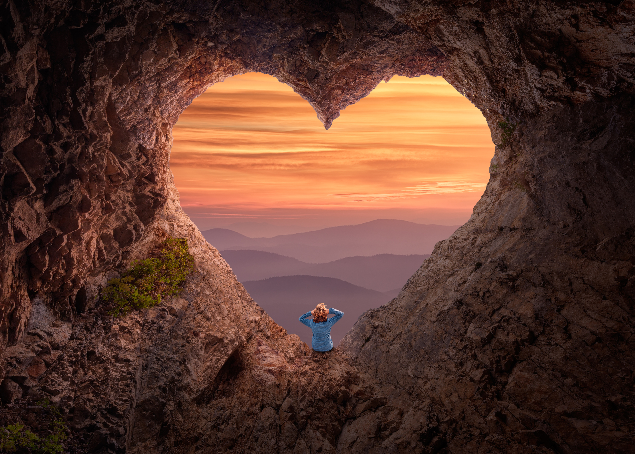 Woman in heart shape cave towards the vast landscape
