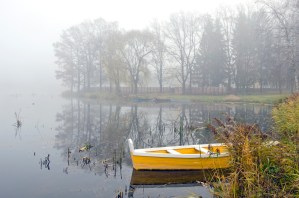 yellow wooden boat on autumn lake and morning mist