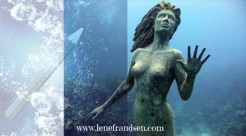 ”Der ér en fortælling” bekræfter hun, som nu rejser sig fra bølgerne, hendes hud glinser i blå kaskader af vand. Hun er enorm, så voldsom, så grim. Da sker det. Alle mine forhold opløses som pulverkaffe og kærligheden vokser i mit hjerte. Dér står et træ. Et kærlighedstræ midt i vandet.