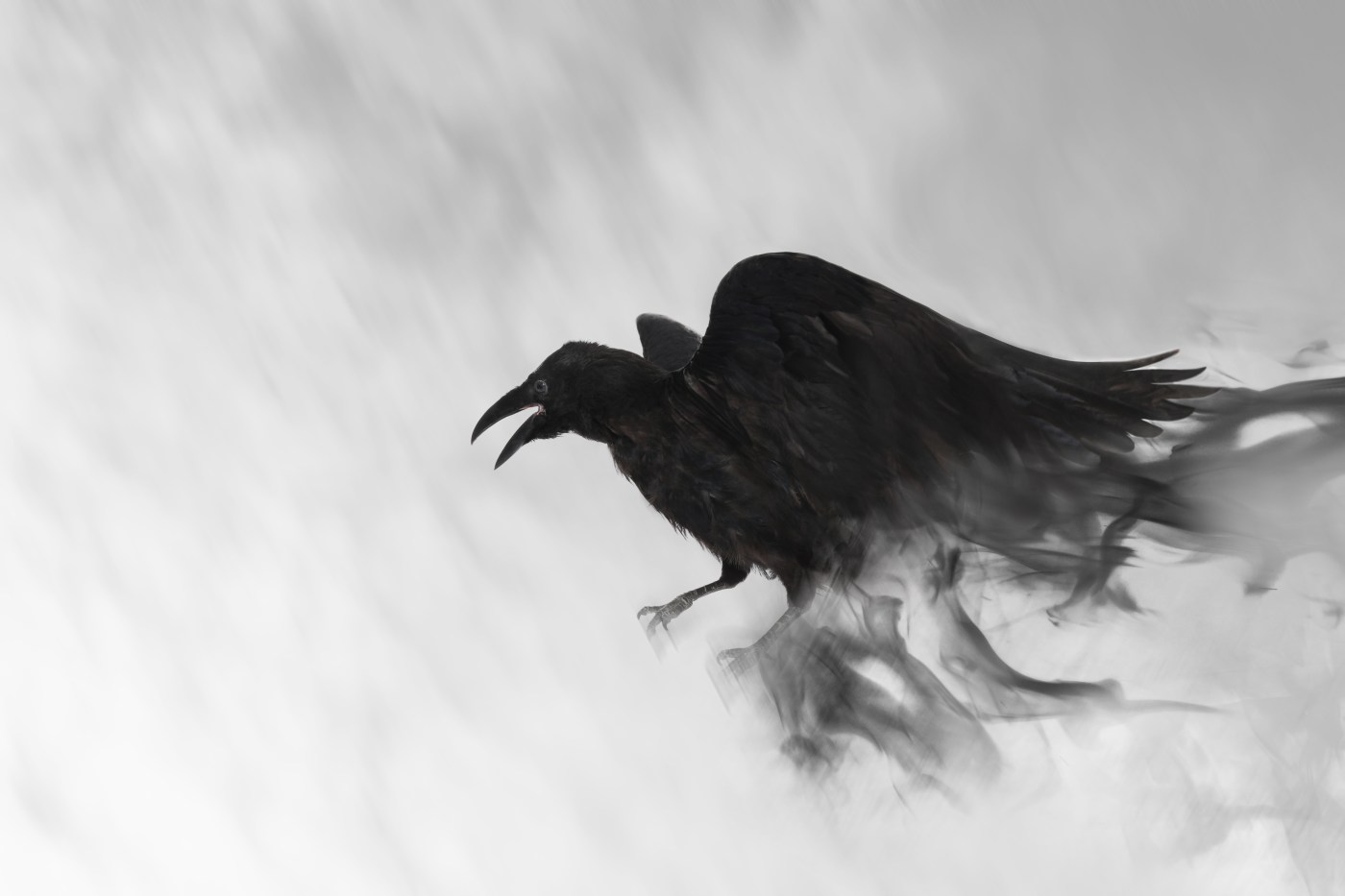 Solen skinner pludseligt, da jeg træder ind i hendes sfære. Hun lyser op i et smil. Hendes hår er vindblæst og det ene øje dækket, hendes sorte frakke flagrer i vinden som vinger. Og da sker det. Uden at jeg kan fortælle dig hvordan, bliver hun til en ravn. Det sker så hurtigt, at jeg ikke kan nå at opfatte det, det er som et synsbedrag og så er hun en fugl. Hun siger ikke noget, ser blot på mig og letter så fra jorden for at lande i det eneste træ, jeg kan få øje på længere oppe på land.