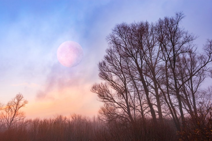 Inden jeg skrev, gik jeg morgentur med hunden. Månen hang i vest over træerne, himlen var mørkeblå. Jeg gjorde holdt og stod lidt og nød det smukke syn, følelsen af at være til stede, mærke vinden, den kølige morgen under aftagende måne. Ja, faktisk er det stadig fuldmånefase, men når månen hænger i vest om morgenen, er den aftagende.