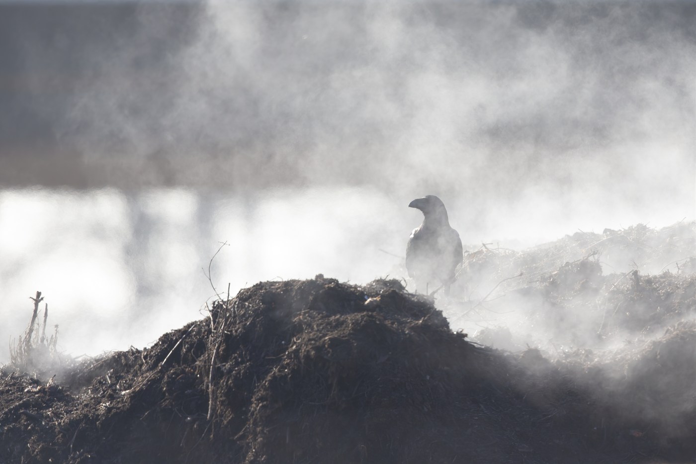 ”Nej.” Ravnen ler og pludselig letter hun og flyver ud over havet. Væk i tåge.