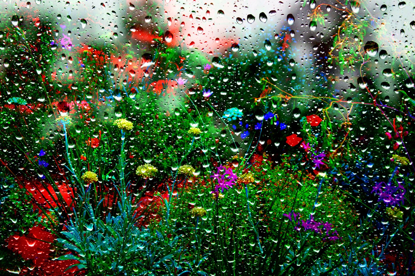 Det regner udenfor, dråberne danser på taget og laver trommelyd. Vi går tilbage til køkkenet og beslutter os for at spise dér. Det er lidt køligt derude nu, da det har regnet hele morgenen. Landskabet ligger svøbt i regndis, sommeren tager en pause.