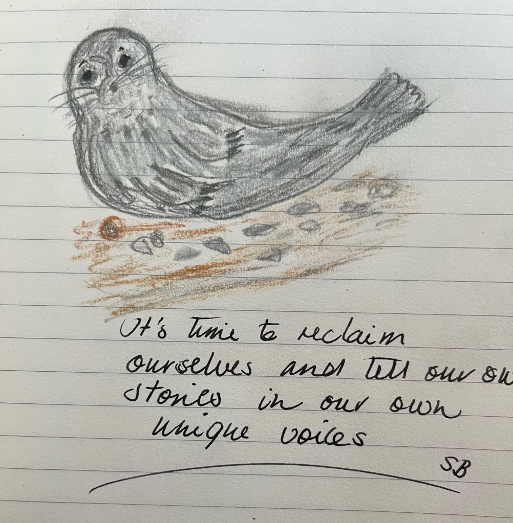 I morges trak jeg Sælen, Bregnen og Narren. Herefter skrev jeg lidt og så tegnede jeg sælen i min rejsedagbog. Så greb jeg manuskriptet til Huset ved Havet og skrev lidt videre på Eidheanns historie, den bid, jeg delte med dig i dag. Inden længe skal jeg med glæde læse de fortællinger, som kvinderne på mine skrivehold har delt. Jeg skal bevidne deres skriverejse og læse deres ord om processen. Processen er nøglen. Den forandrer os over tid og lærer os det, vi har brug for at kunne. Vi finder vores egen stemme gennem dybt personlige fortællinger, der skænker os historiemedicin for sjæl og hjerte.