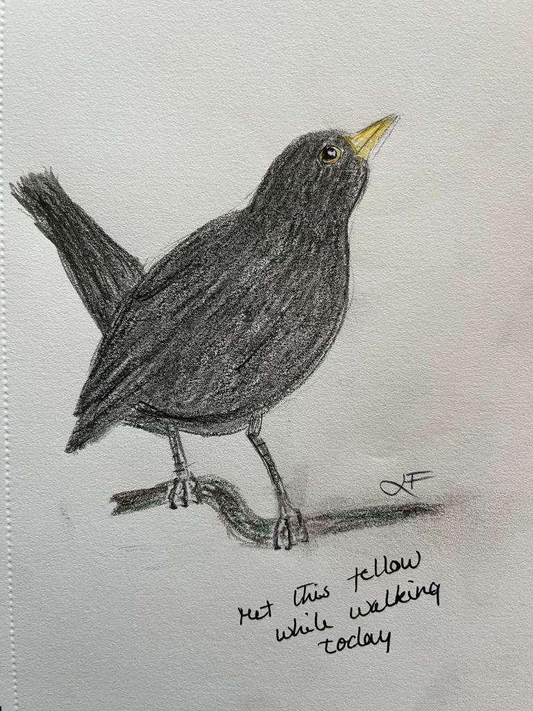 Jeg ser på ham og videre ned på mine støvlesnuder. Der er mudder op af sålerne, sneen er smeltet nu og regnen tager til. Stranden ligger hen i regndis. Selvom det er midt på dagen, er lyset dæmpet og dagen en af de mørke. Jeg var på vej tilbage fra en af mine aleneture, jeg ville tage lidt brænde med ind. Tænde op i pejsen, lave te og nusse Fleur bag ørerne, inden jeg åbnede min rejsedagbog og skabte rum til at skrive. Så mødte jeg ham. Solsorten. Og her står jeg nu i sileregn og sludrer med sort fugl.