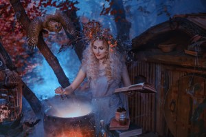 atmospheric cold autumn photo in art processing, a good witch creates a magic elixir near his forest home, holding a book in her hands, dressed in an old gray linen dress and has a wreath on her head Skriv en kommentar Annuller svar Δ